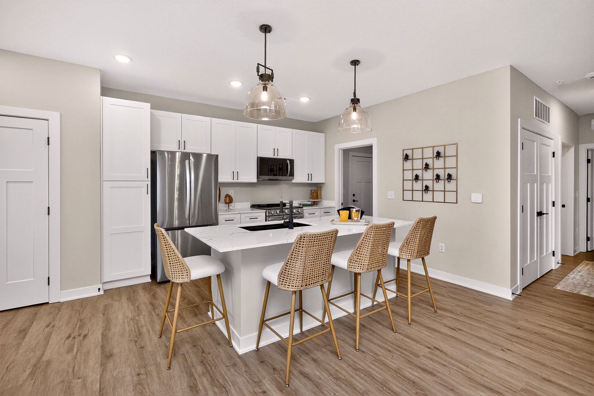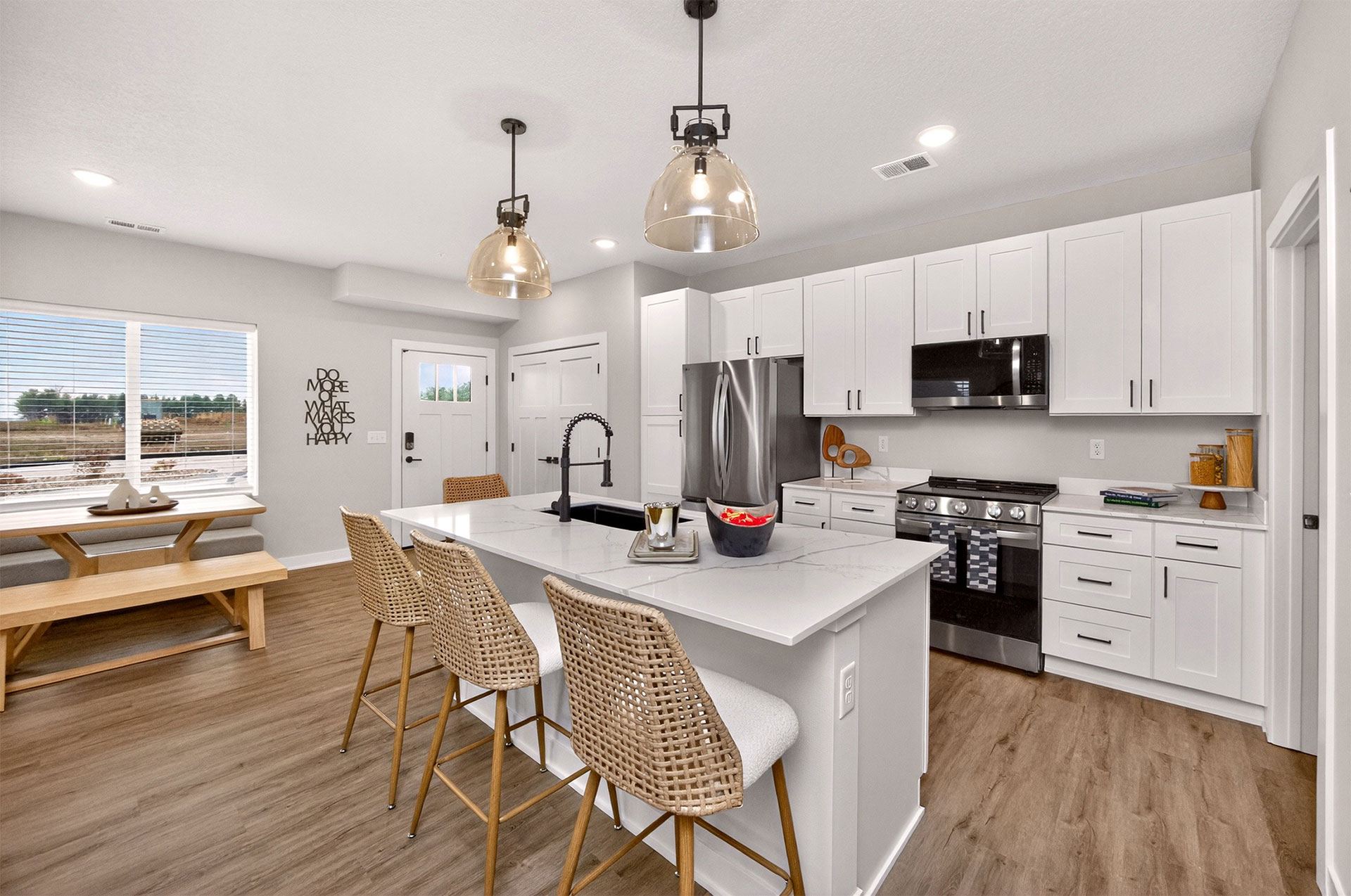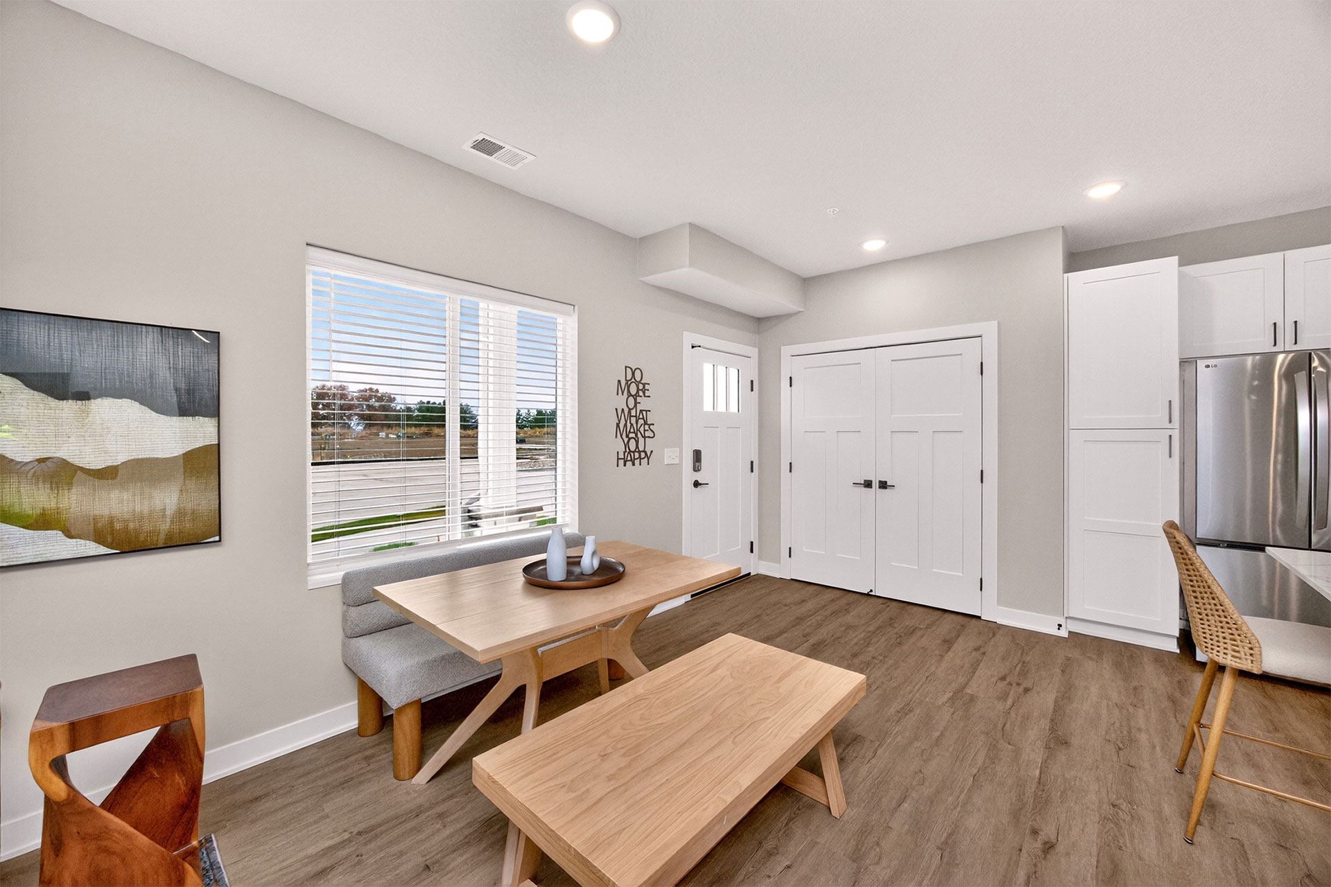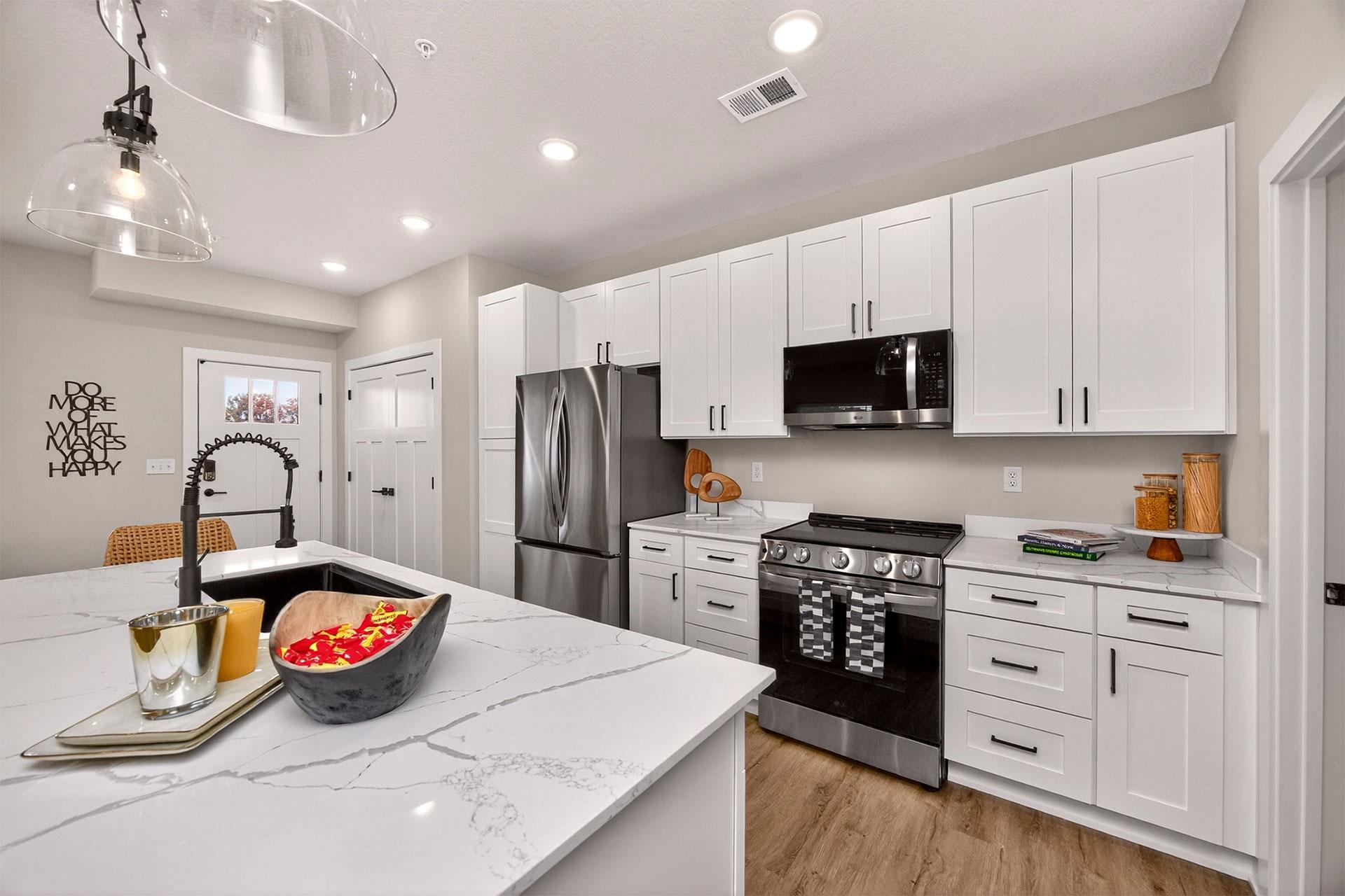 Picket Fence offers thoughtfully designed 1, 2, and 3-bedroom apartments and townhomes, each with an attached garage. Inside, enjoy quartz countertops, stainless-steel appliances, in-unit laundry, and elegant wood-style flooring. Select homes include private balconies, double vanities, and pantry storage.