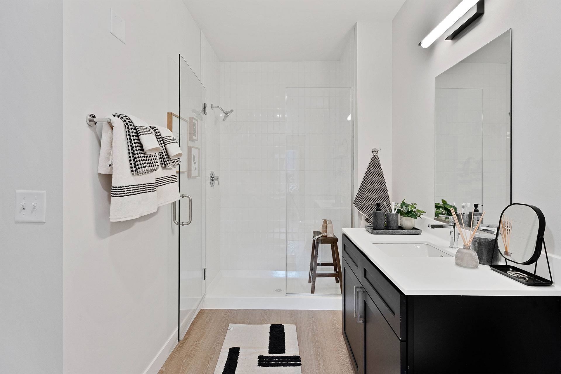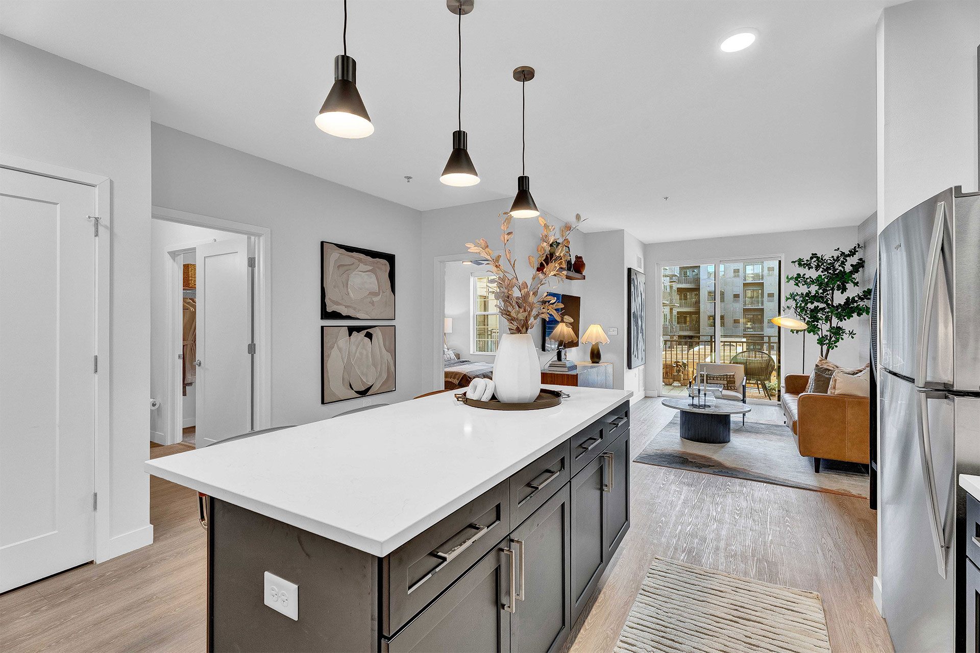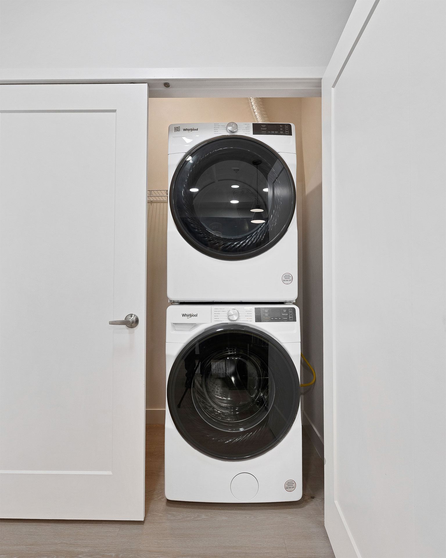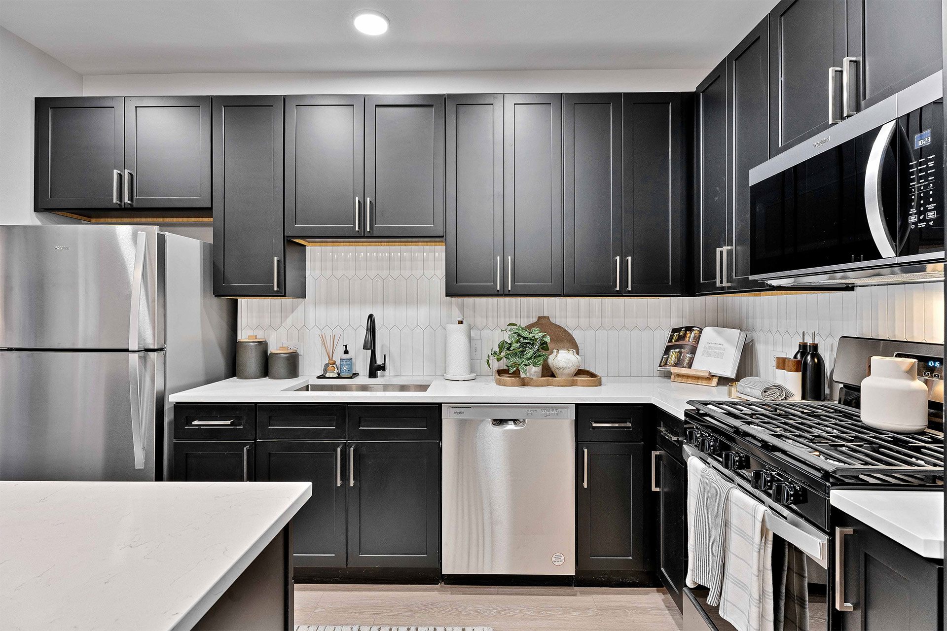 Choose from two stylish finish packages featuring white or black kitchen cabinetry, each with quartz countertops, stainless-steel appliances, and in-home Whirlpool washers and dryers. Select homes also include private patios or balconies, spacious walk-in closets, and kitchen islands for added convenience.