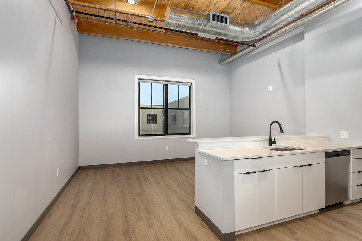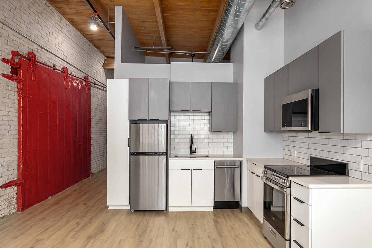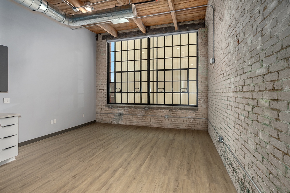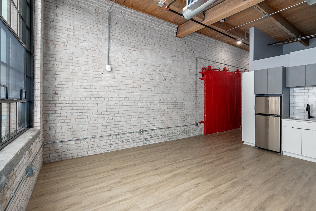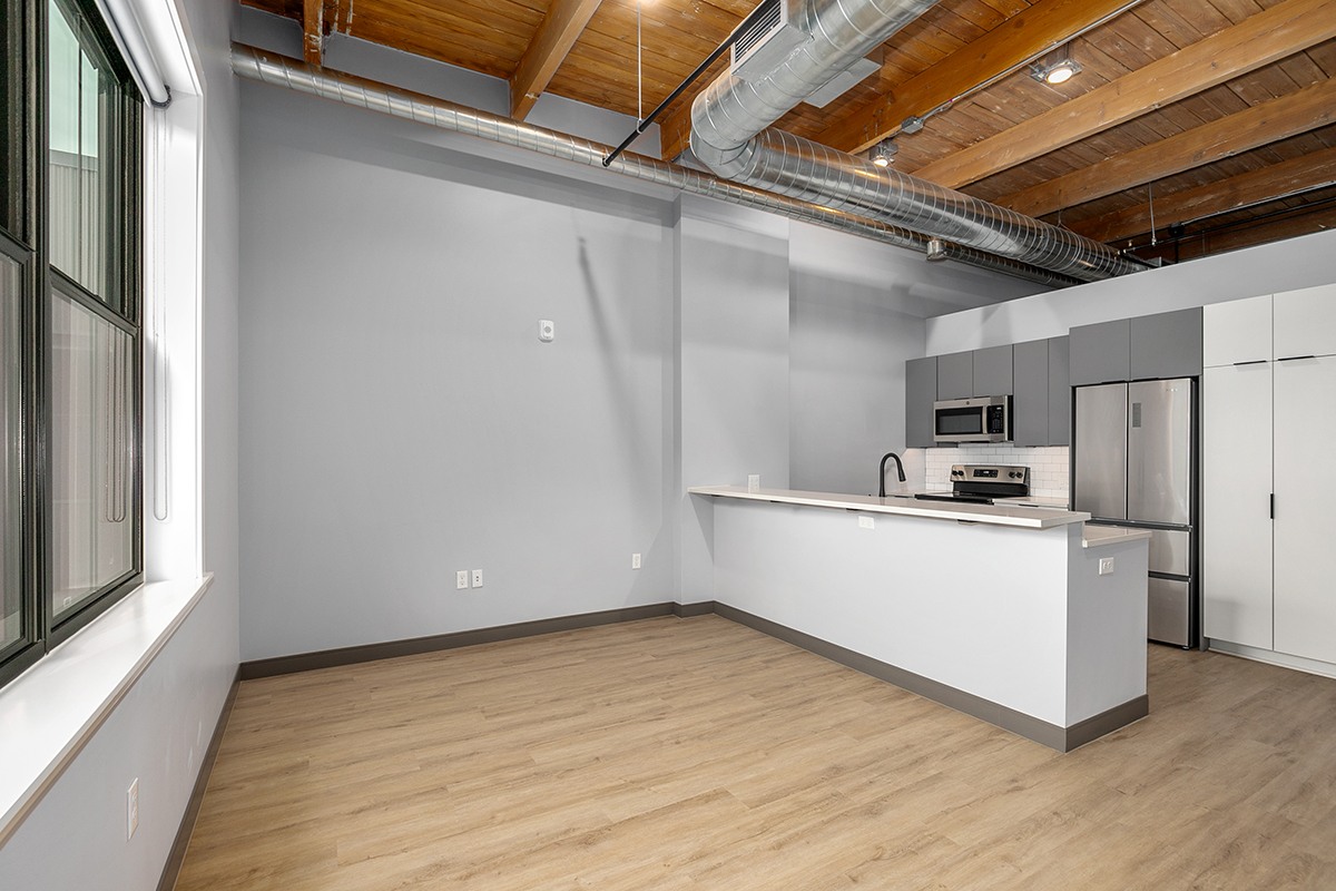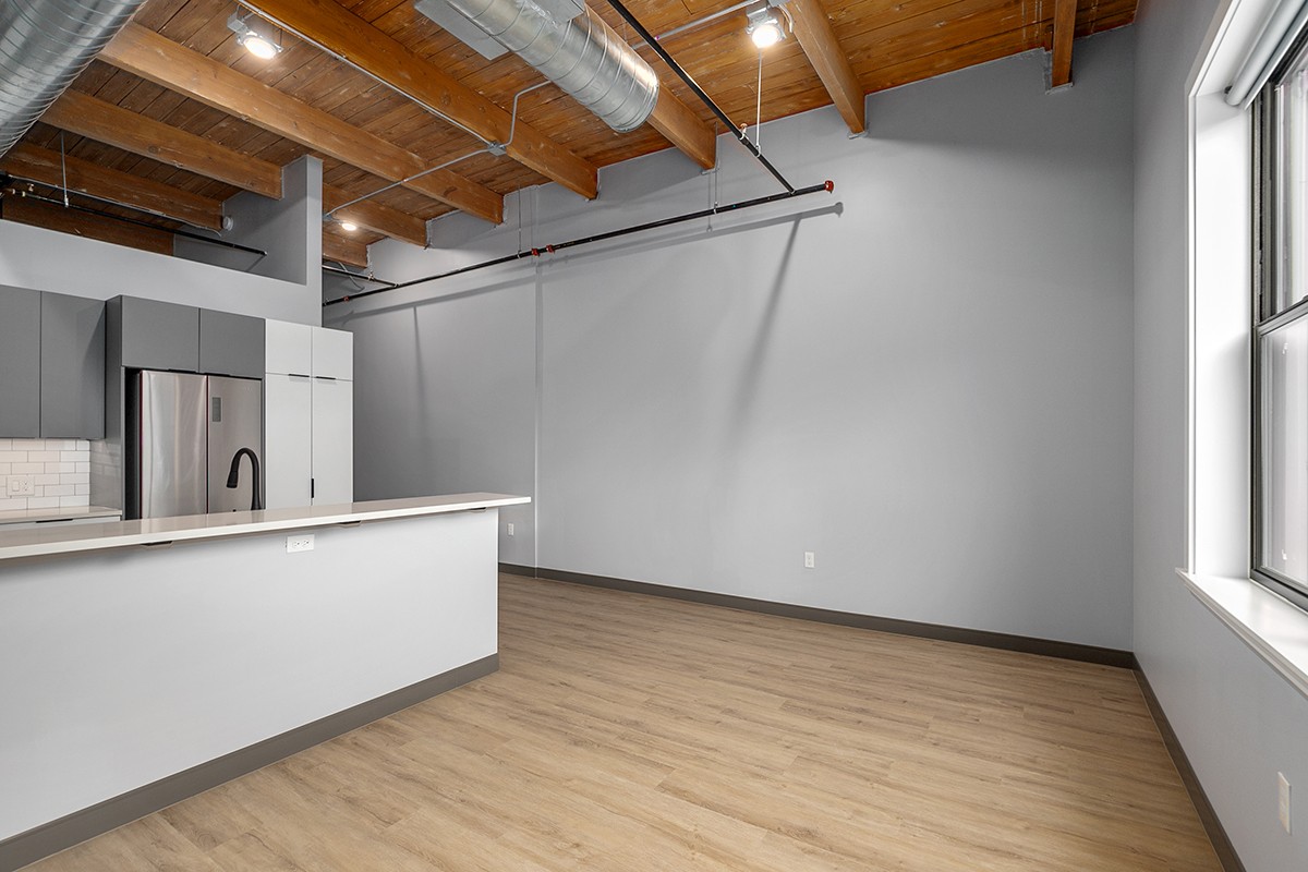 Box Board Lofts brings new life to a historic Grand Rapids warehouse, offering beautifully renovated studio, one, and two-bedroom loft-style apartments. Each home features soaring 12-foot ceilings with exposed beams, quartz countertops, stainless-steel appliances, wood-style flooring, in-unit washer and dryer, and smart home technology for modern convenience.