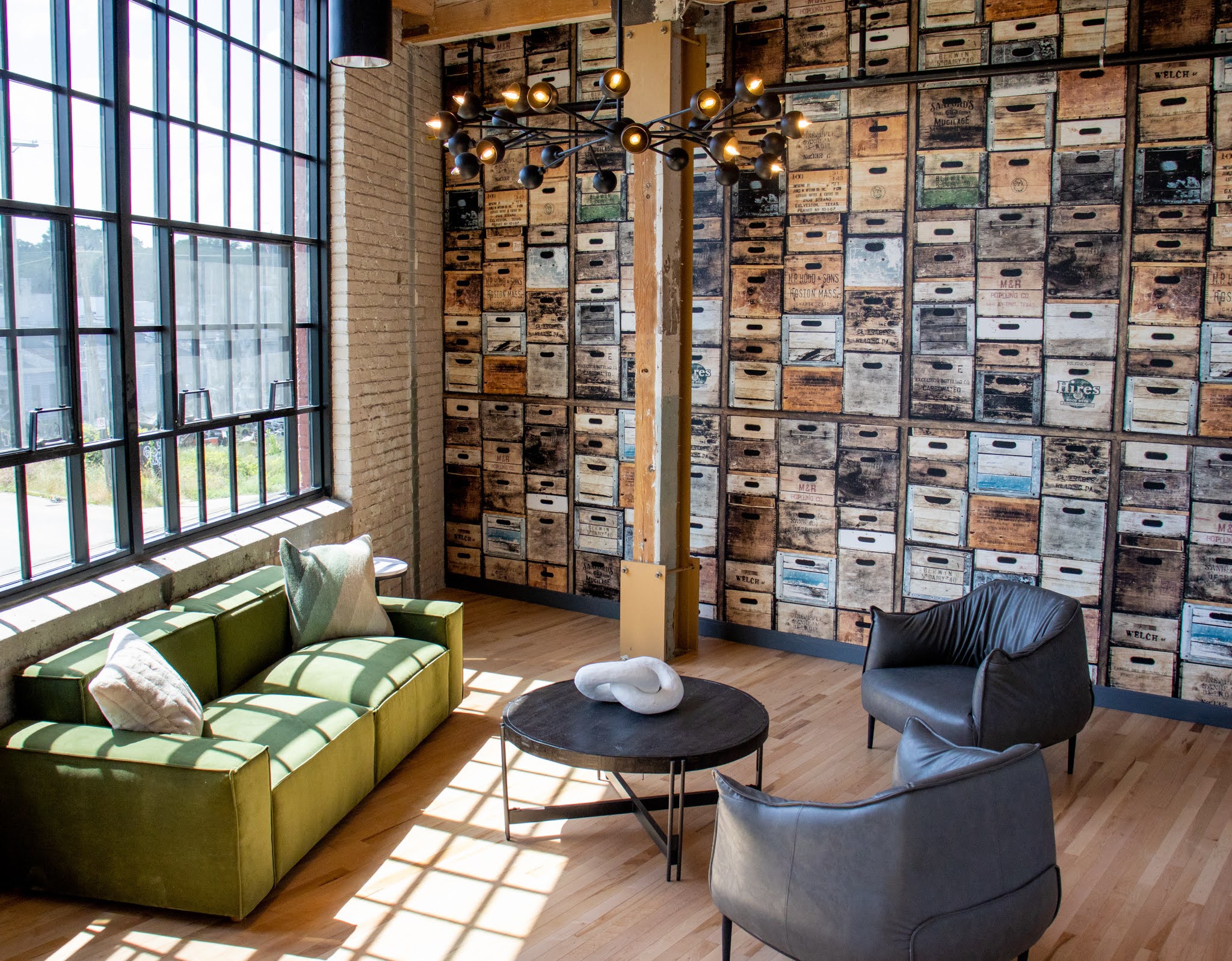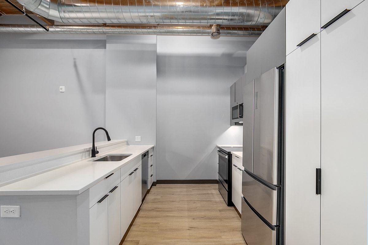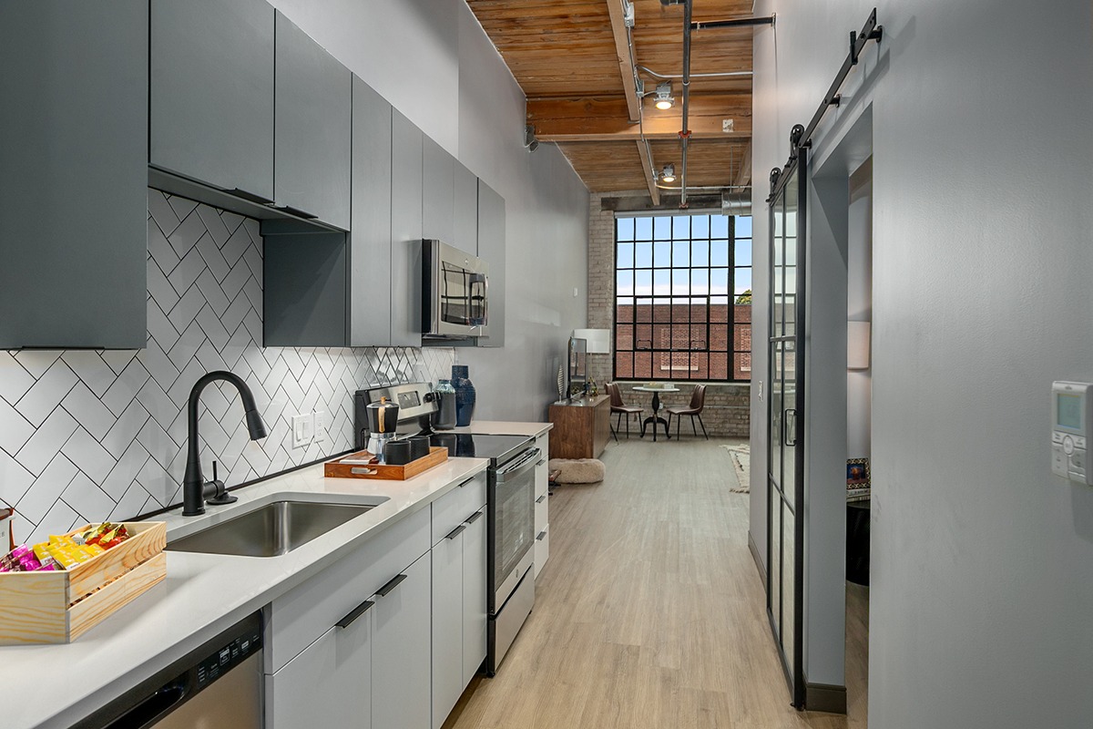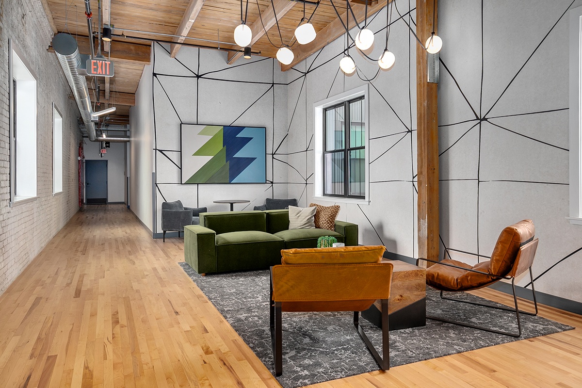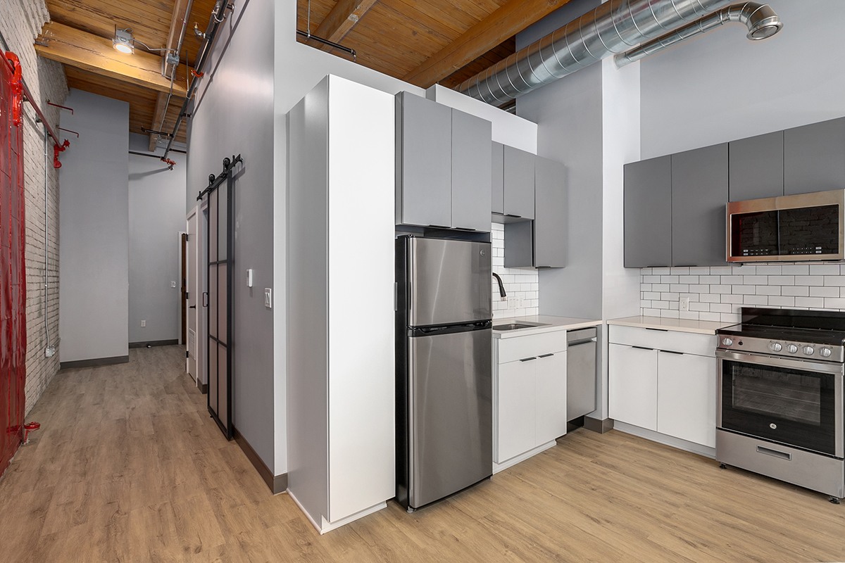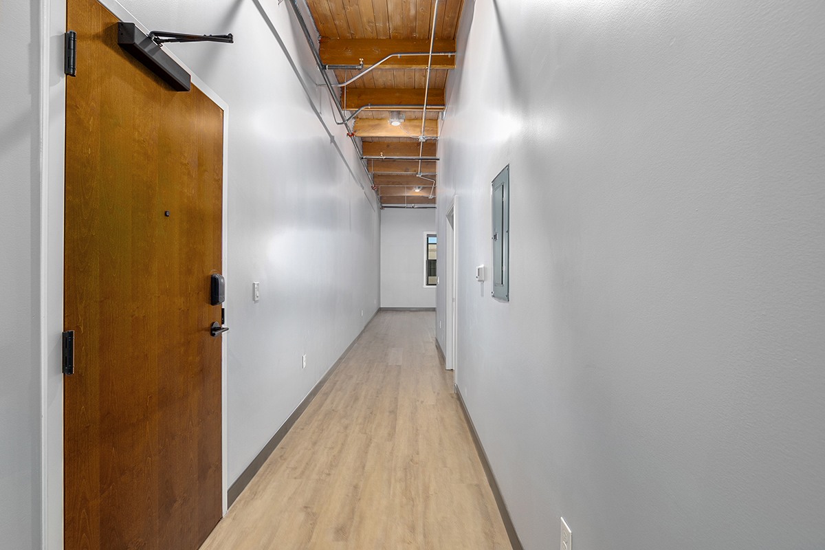 Box Board Lofts brings new life to a historic Grand Rapids warehouse, offering beautifully renovated studio, one, and two-bedroom loft-style apartments. Each home features soaring 12-foot ceilings with exposed beams, quartz countertops, stainless-steel appliances, wood-style flooring, in-unit washer and dryer, and smart home technology for modern convenience.