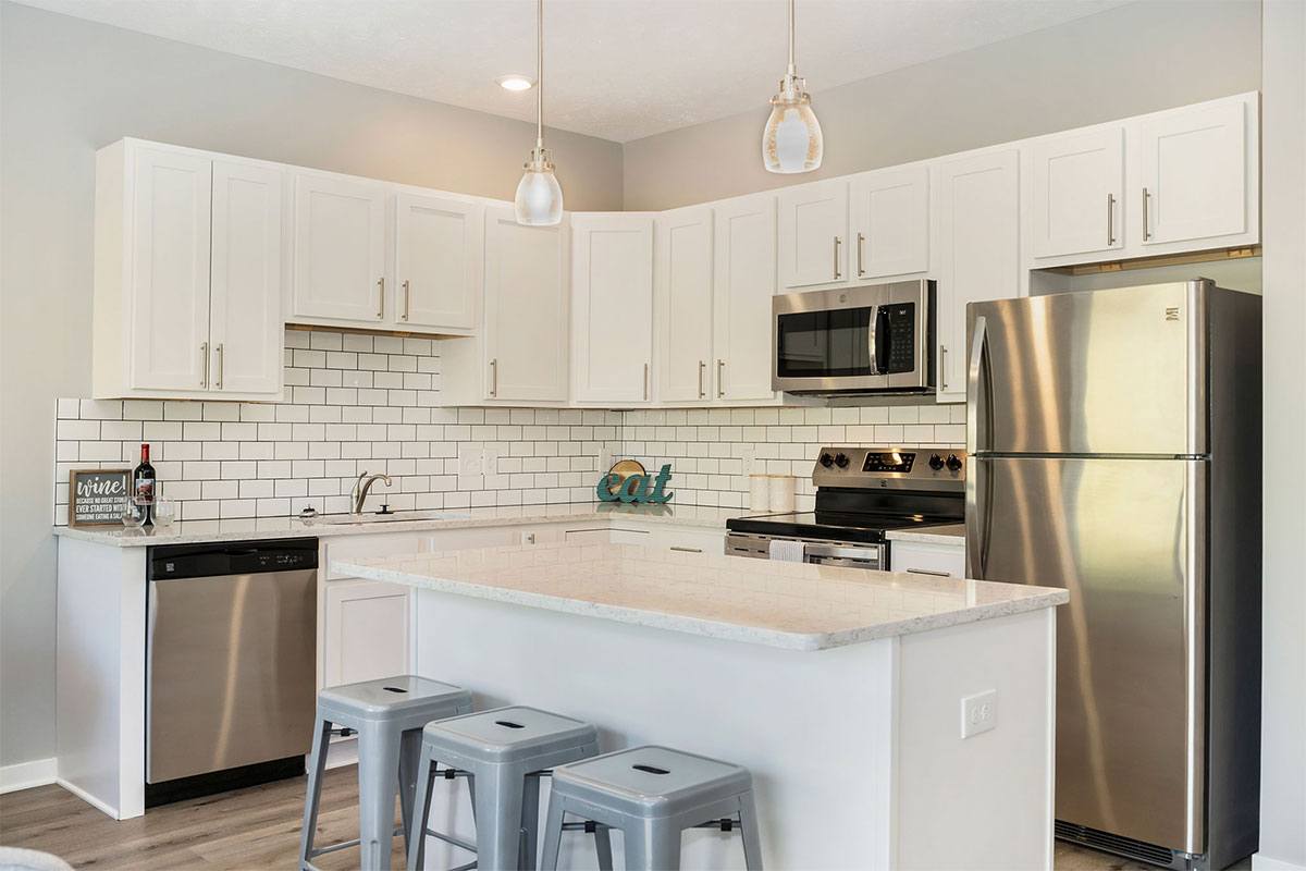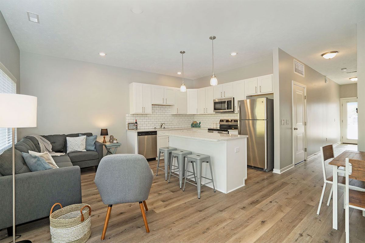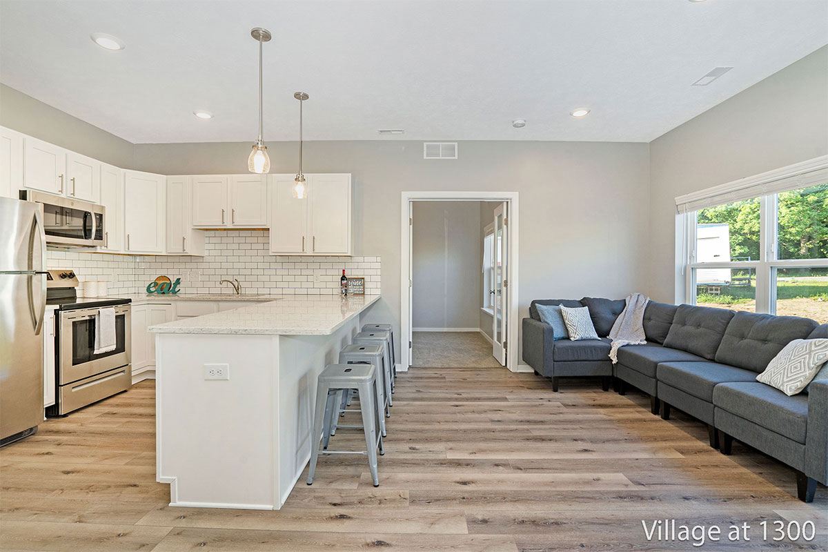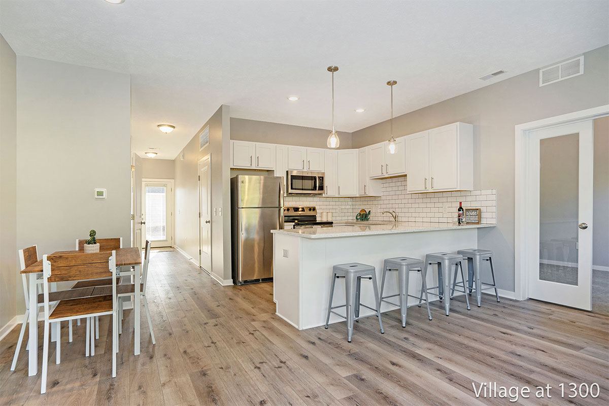 Conveniently located less than five minutes from I-96 and U.S. 131, Village at Thirteen Hundred delivers Condo-style townhomes in Grand Rapids, MI. Managed by the award-winning Village Green management company, our neighborhood is home to generously-spaced, one, two, and three-bedroom floor plans, each accented with premium finishes, ultramodern amenities, and first-class hospitality. Every townhome features sleek quartz countertops, stainless steel appliances, and beautifully tiled backsplashes. Our contemporary gourmet kitchens are also equipped with over-the-range microwaves, dishwashers, garbage disposals, and electric glass stovetops. Large walk-in closets make storing and organizing effortless, and a full-size in-unit washer and dryer mean an end to costly fees at your local laundromat. Nine-foot ceilings and loft-style floor plans complement the large size of select homes. For resident peace of mind, each townhome has a private entryway, a one or two stall dedicated garage, and your choice of a private patio or balcony. Every home is pet-friendly, and our neighborhood even offers a dog park to ensure your furry friends enjoy living at Village at Thirteen Hundred just as much as you do. If location is everything, Village at Thirteen Hundred undoubtedly has it all. A highly anticipated new development on the city’s northeast side, these townhomes for rent in Grand Rapids are located just 10 minutes from downtown and major employers like Spectrum Health, Amway, Steelcase, and Grand Rapids Public Schools. Back at home, residents never have to venture far for recreation and leisure as our neighborhood landscape houses an outdoor lounge area with stone fireplace as well as an outdoor kitchen and grilling station, perfect for summer gatherings with neighbors and friends. Be the first to experience Village at Thirteen Hundred! Our professional sales team can’t wait to show you around your brand new home!